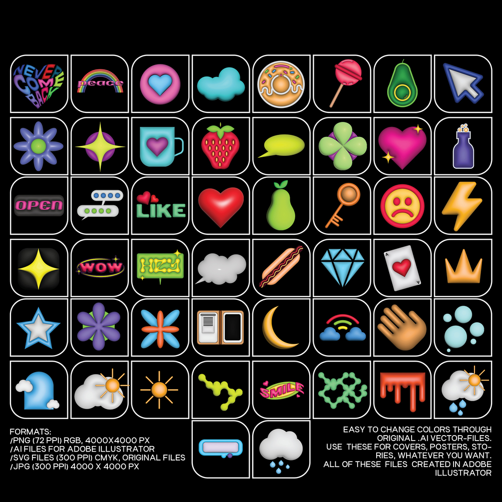 3D VECTOR SHAPES - is a bundle of 50 random vector shapes. These will work ideally for posters, covers, graphics, stickers, stories - whatever you want. Just be creative!
