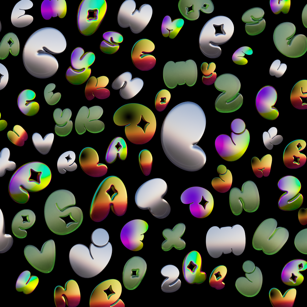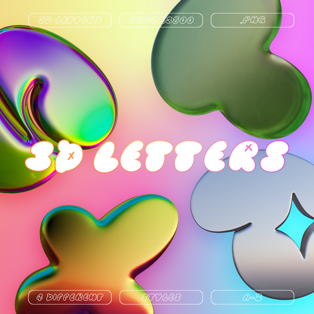 Introducing 3D Letters PNG! Our new product features 4 unique styles of 3D letters: chrome, iridescent, sunset, and jelly!
